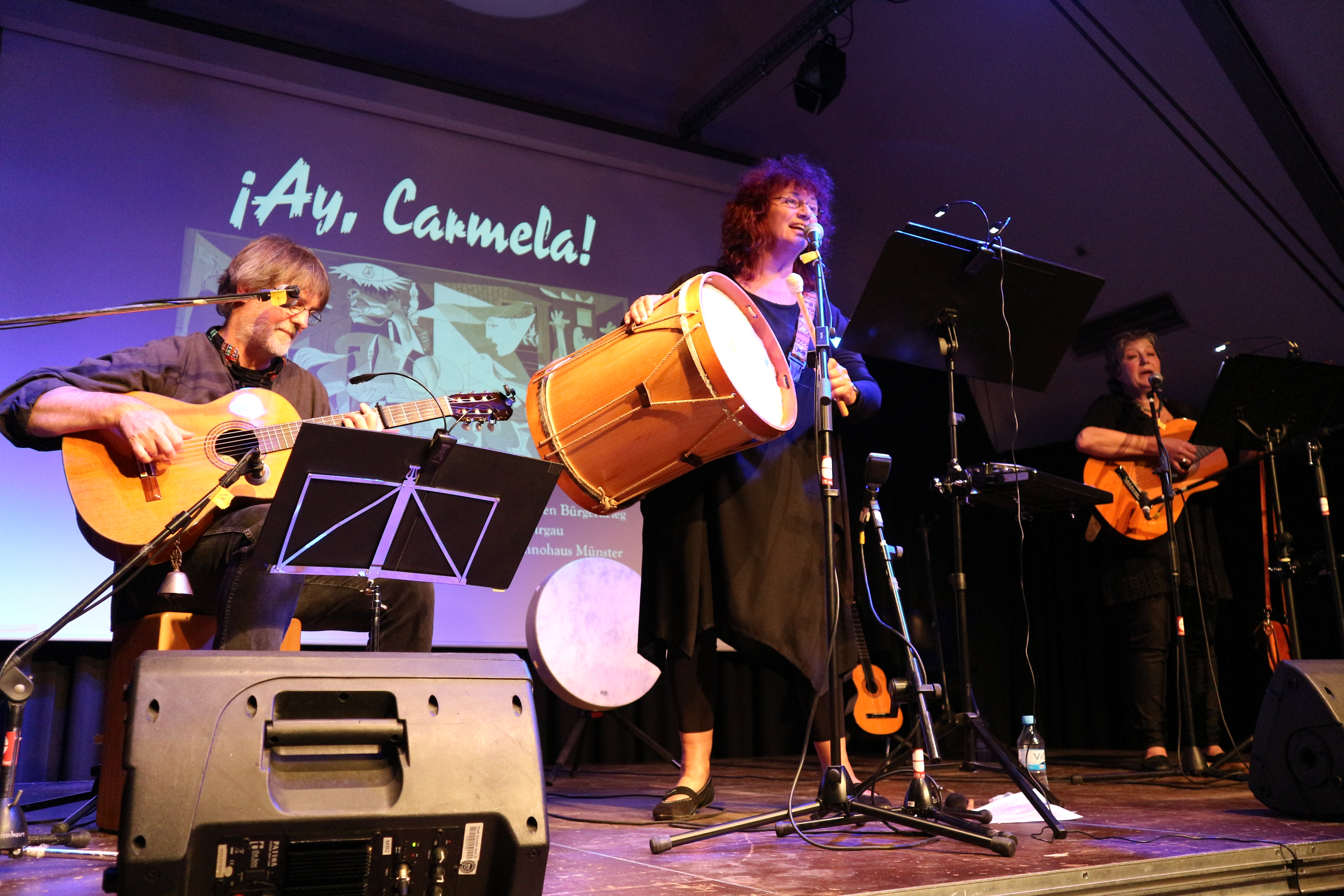 Die Revue „¡Ay, Carmela!“ bringt uns alte Bilder, Gedichte, u. a. von García Lorca und Pablo Neruda, und Volkslieder aus Spanien und anderen Ländern näher. In der Zeit des Bürgerkrieges wurden sie umgetextet und waren den Kämpfern um die Republik Trost und Ansporn. Noch heute werden sie in den verschiedenen Sprachen gesungen. Wie das Lied „¡Ay, Carmela!“, eines der bekanntesten Lieder der AntifaschistInnen in Spanien.